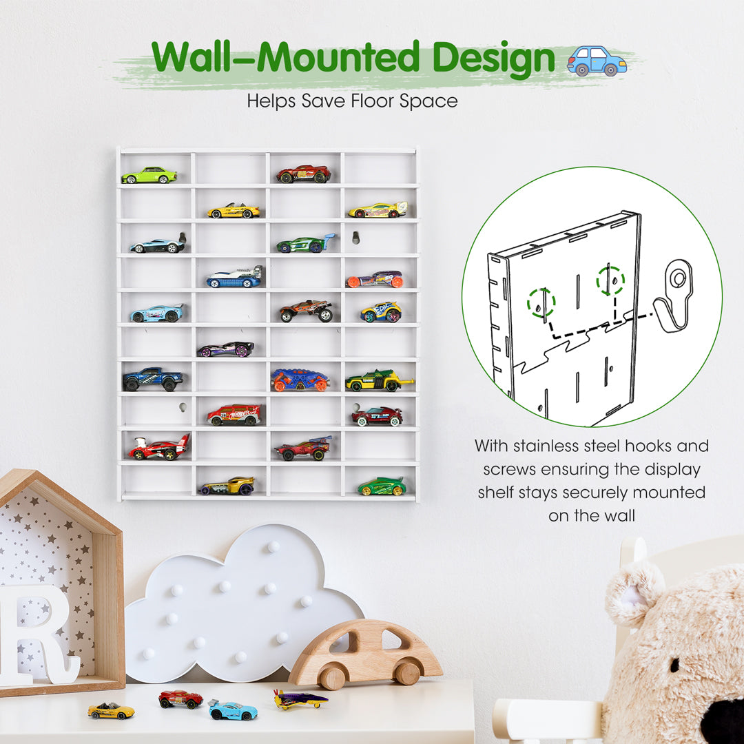 - Space-Saving Wall-Mounted Design: The wall-mounted design helps save floor space. The package includes stainless steel hooks and screws, making it easy to hang and ensuring the hot wheels display shelf stays securely mounted on the wall