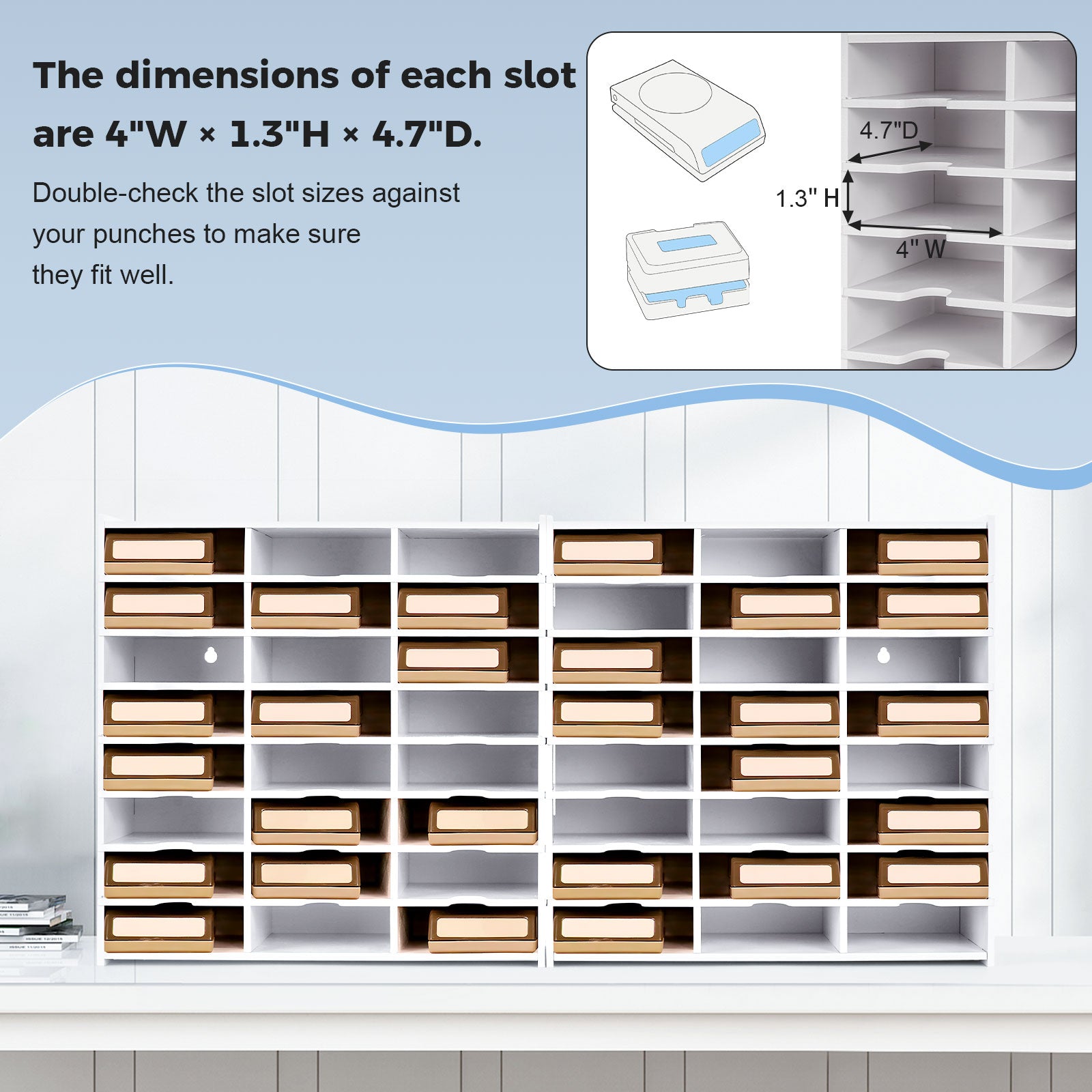 - Each slot measures 4" W × 1.3" H × 4.7" D, ideal for keeping your punches organized and easily accessible